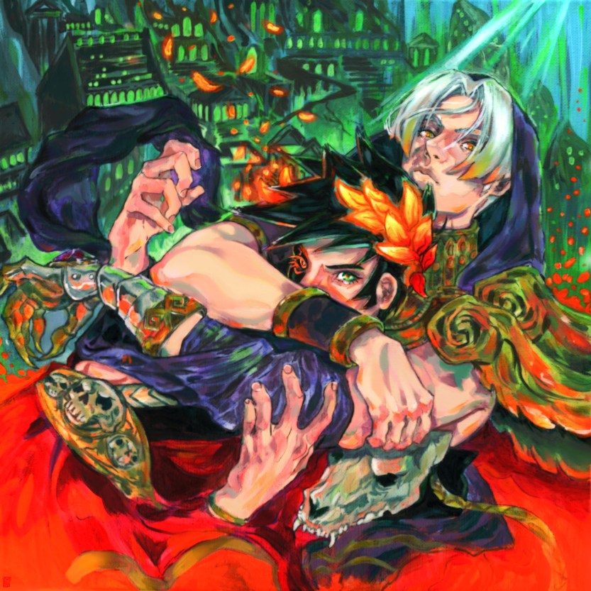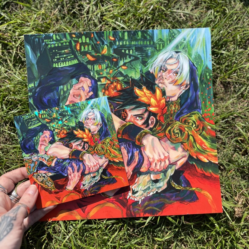 Just in time for Hades 2, this little square print of a canvas painting features Zag and Than over the land of the undead. Help Zag escape, or help Than hold on by getting this print