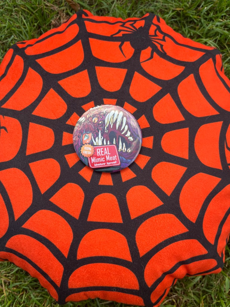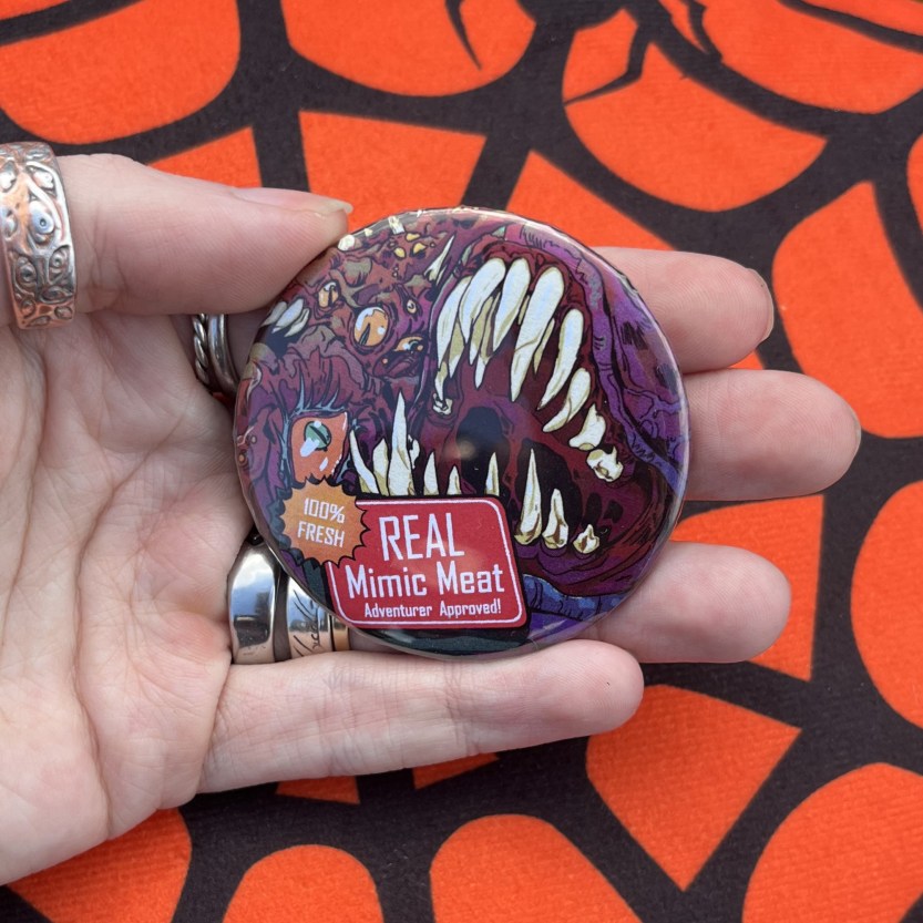 2” Mimic Meat tabletop rpg button! Has your party just done something cool deserving some prime cuts of good quality wholistic meat? Can’t get your hands on slabs for cheap on short notice? These are not meat, and should not be consumed, and we promise they aren’t real mimics. At least, we think they aren’t.