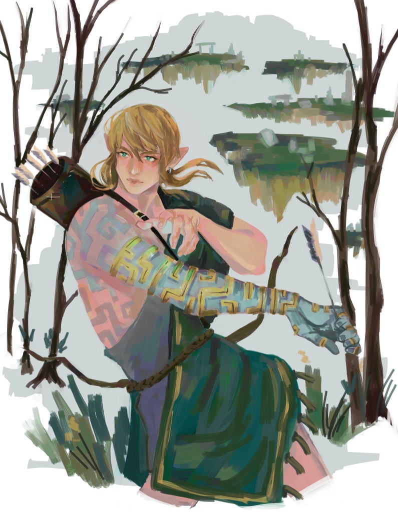 TOTK Link might not have a catching arrows mechanic but it doesn’t stop him from trying with recall. This large poster print features the sky islands and link in his archaic tunic!
