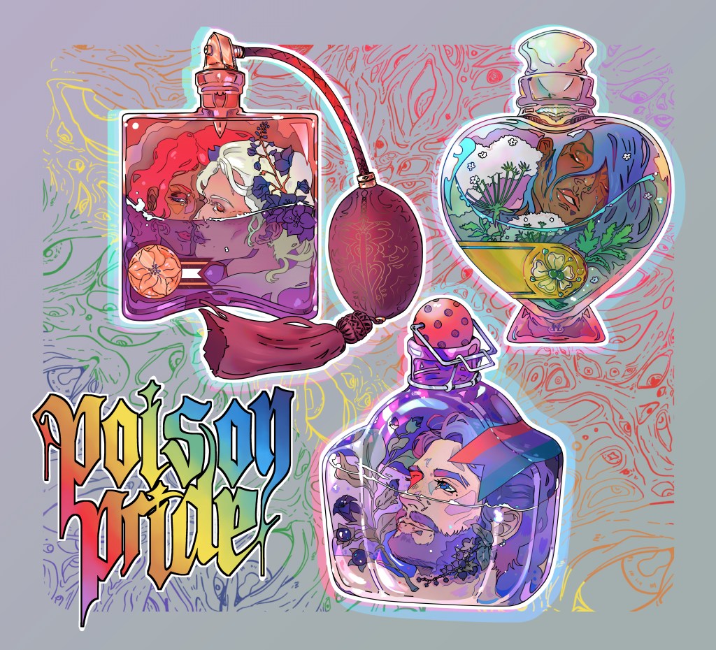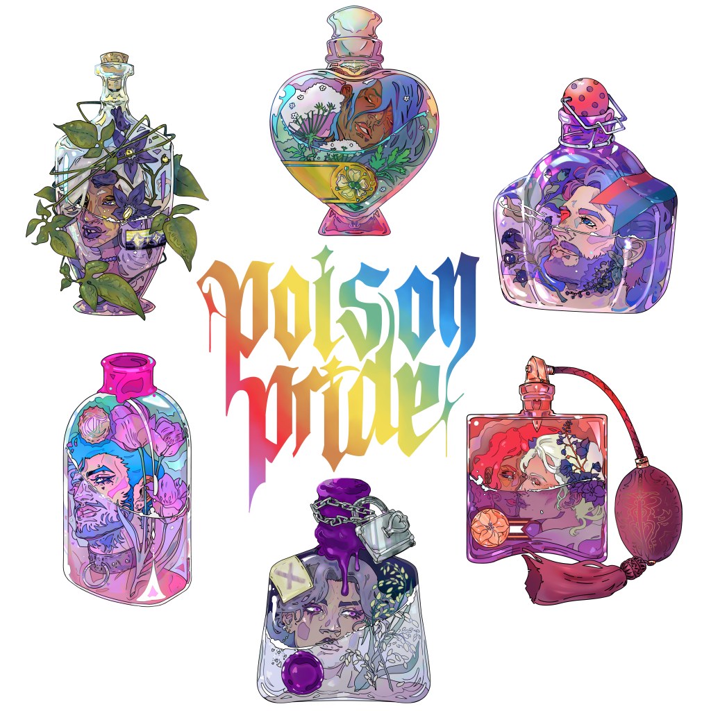 The whole set of Poison Pride holographic stickers, including; Homosexual Hemlock, Bisexual Belladonna, Lesbian Larkspur, and many more! The completed set is eight foiled stickers!