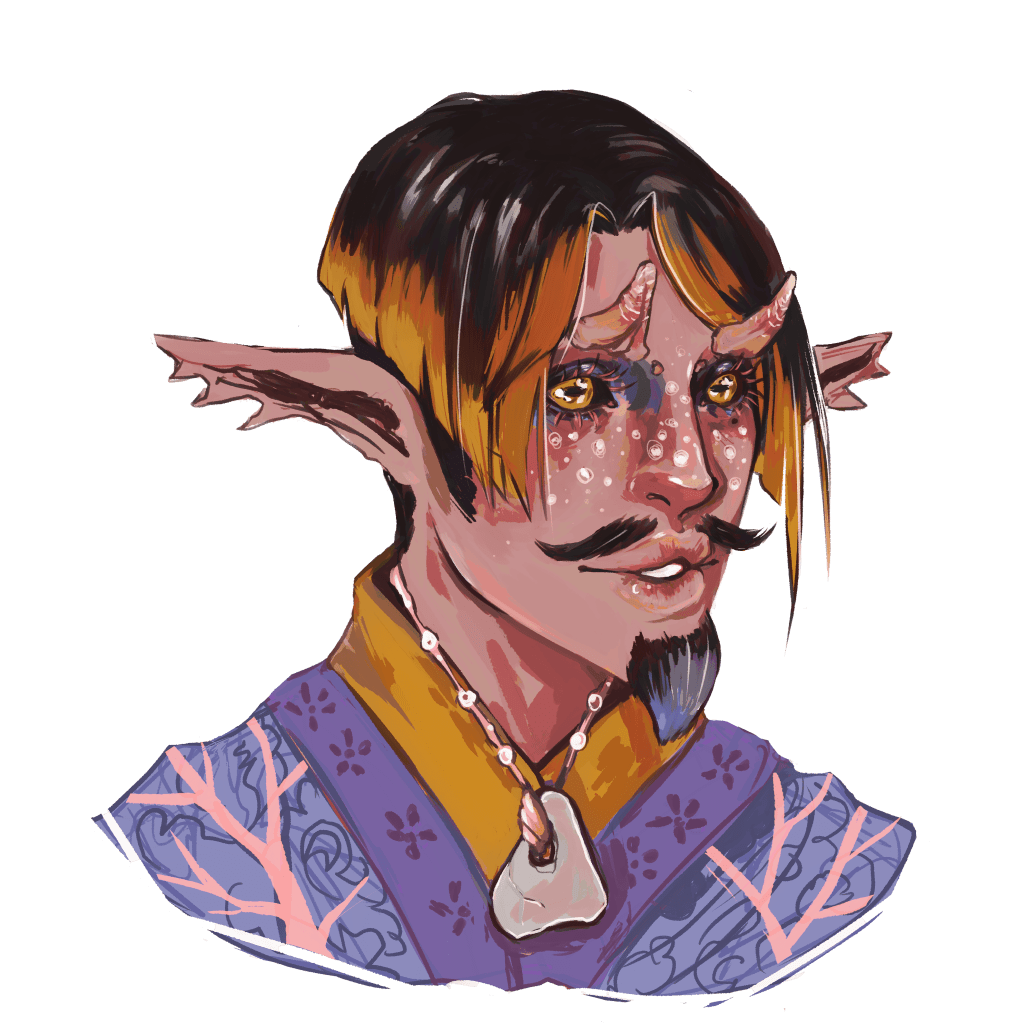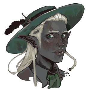 In the city of Briarhtol there are many family hierarchies, and as a child of merchant-nobility Mytis spent his younger years running from his elder siblings in extremely expensive handcrafted shoes. Being the youngest isn’t easy, and being the smallest is even less easy. When a hired military coup brought his family up the ranks to eventually rule over Briarhtol, Mytis fled before the infighting could eventually land him on the throne, and he’s always assumed his siblings followed suit. He’s stopped keeping track of how many steps he is from the crown and has instead started following his childhood dream of becoming a tailor. His parents started their wealth as travelling cloth merchants afterall. Unfortunately in his attempts to create new colour dyes he’s accidentally poisoned himself with arsenic and being a dark elf he’s not quite certain how much the poison is shaving years from his life. He’s started trying to live entirely in the moment and due to his upbringing his morality is rather flexible. Meaning, in short terms, he lies. Compulsively. A lot. His charisma helps him get out of many situations but the lies do start to catch up with him. There’s speculation that his name isn’t even Mytis among merchants he meets.